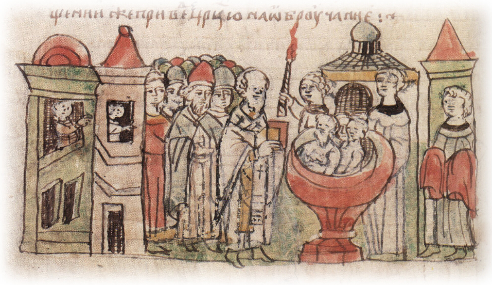 Тайное погребение Владимира Святославича, умершего в Берестове: спуск его тела на землю на ковре между разобранными клетьми здания; положение тела Владимира в мраморный гроб в церкви Святой Богородицы.