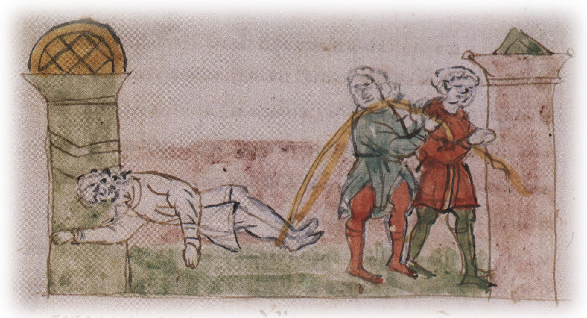 Тайное погребение Владимира Святославича, умершего в Берестове: спуск его тела на землю на ковре между разобранными клетьми здания; положение тела Владимира в мраморный гроб в церкви Святой Богородицы.