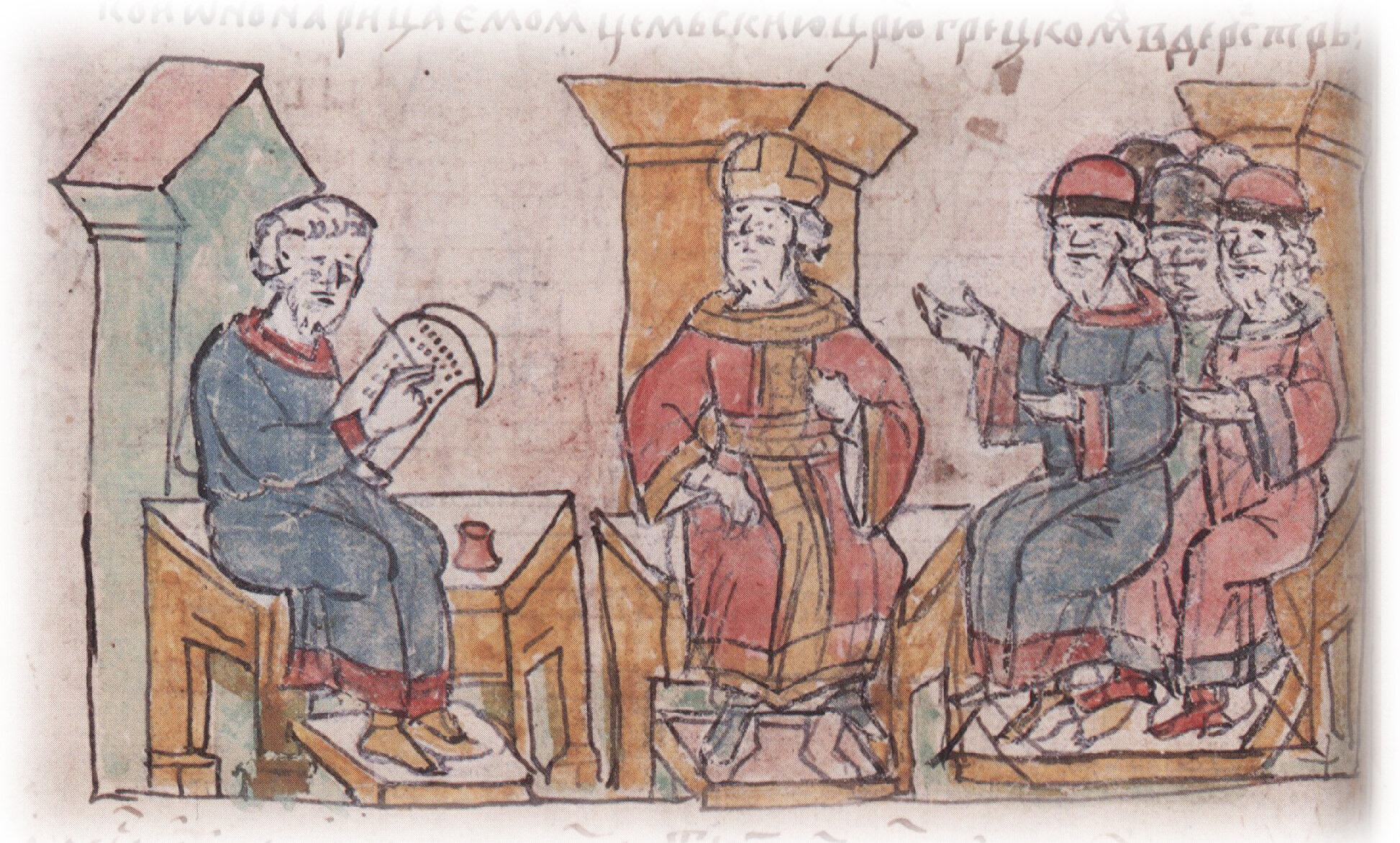 Прием византийским императором Иоанном Цимиехием послов Святослава Игоревича и запись писцом на пергамене условий мирного договора, предложенных грекам русской стороной