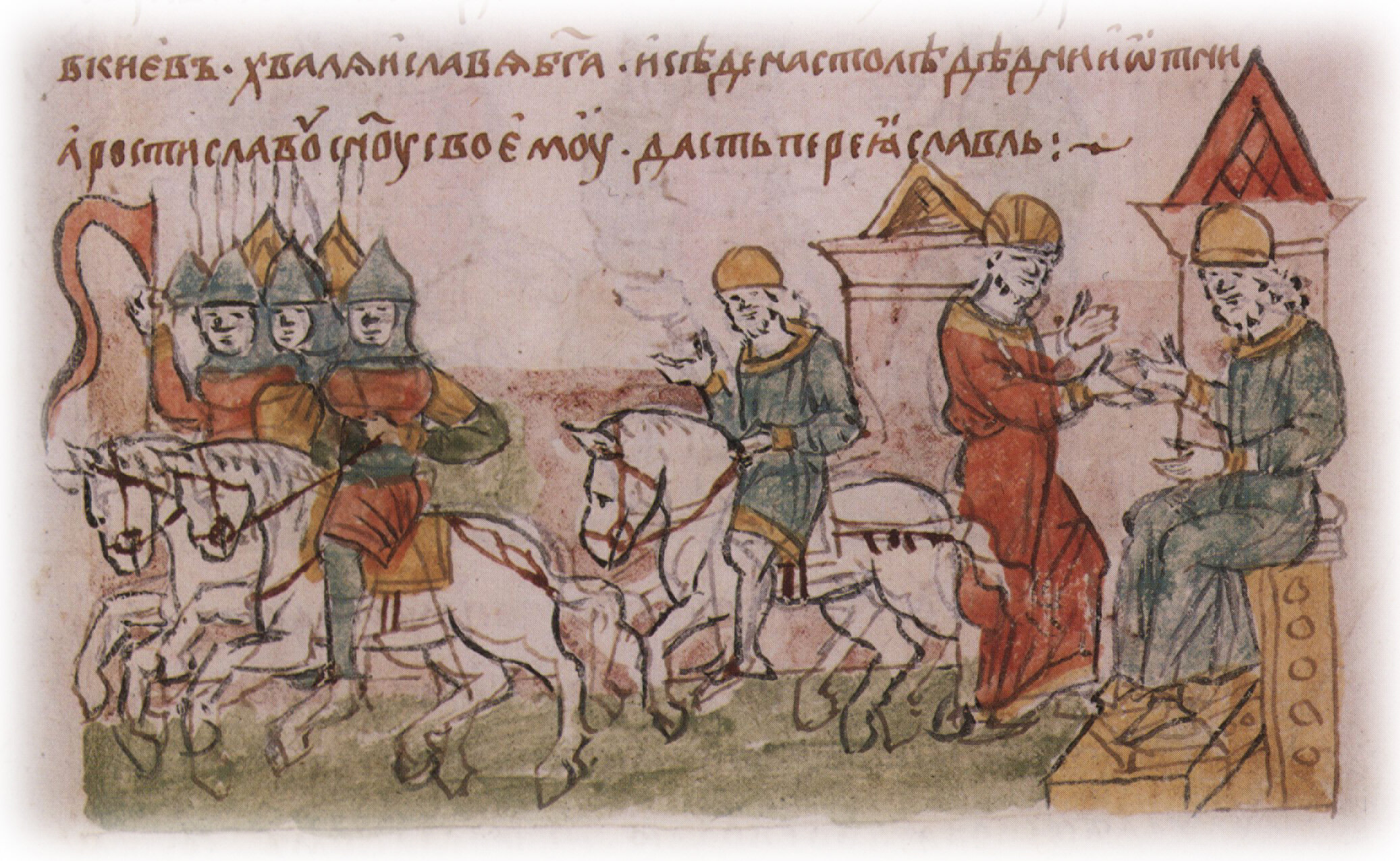 "А Гургий вниде в Киев, хваля и слава Бога, и седе на столе дедни и отни, а Ростиславу, сыну своему, дасть Переяславль".