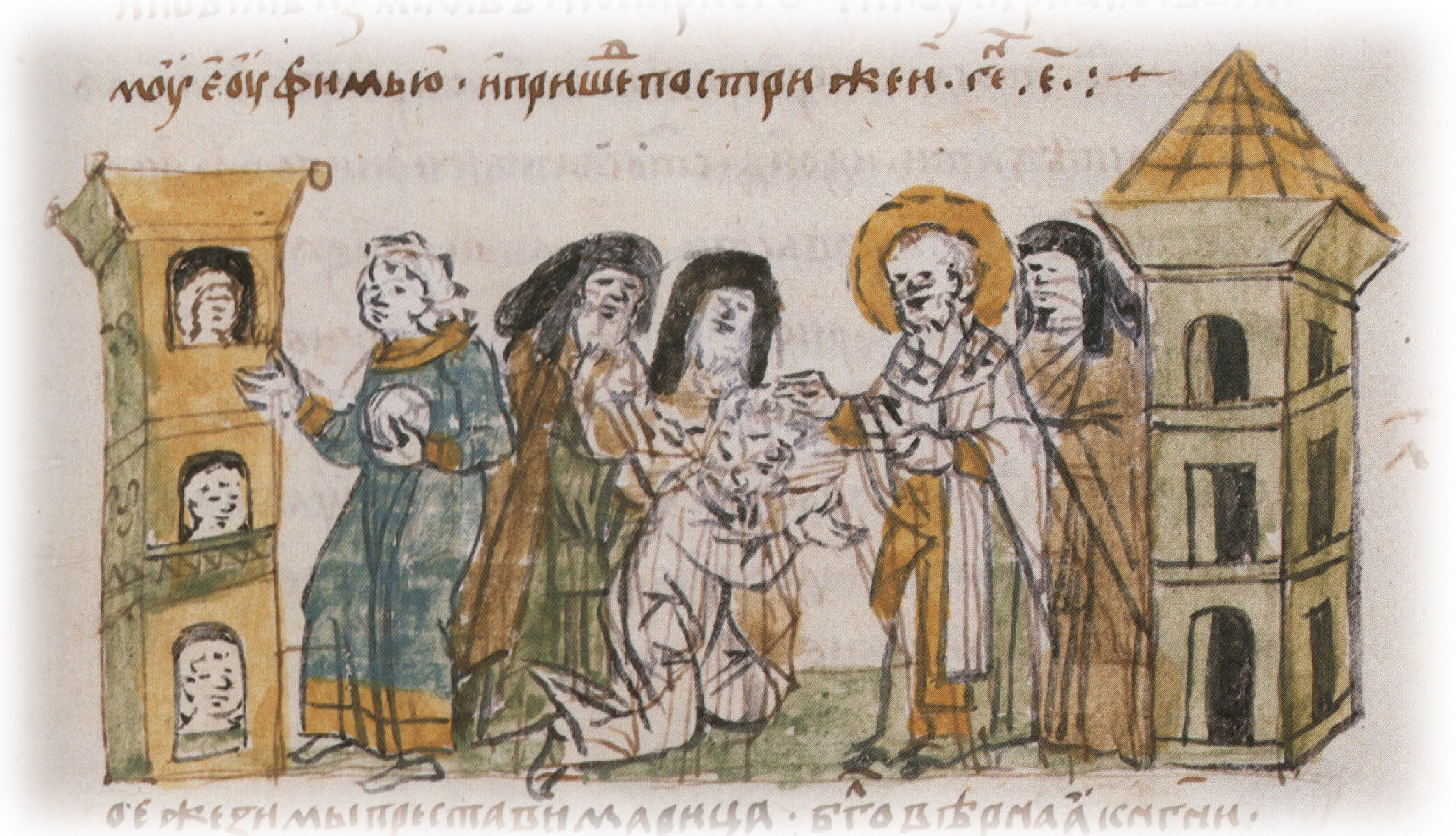 Тайное погребение Владимира Святославича, умершего в Берестове: спуск его тела на землю на ковре между разобранными клетьми здания; положение тела Владимира в мраморный гроб в церкви Святой Богородицы.