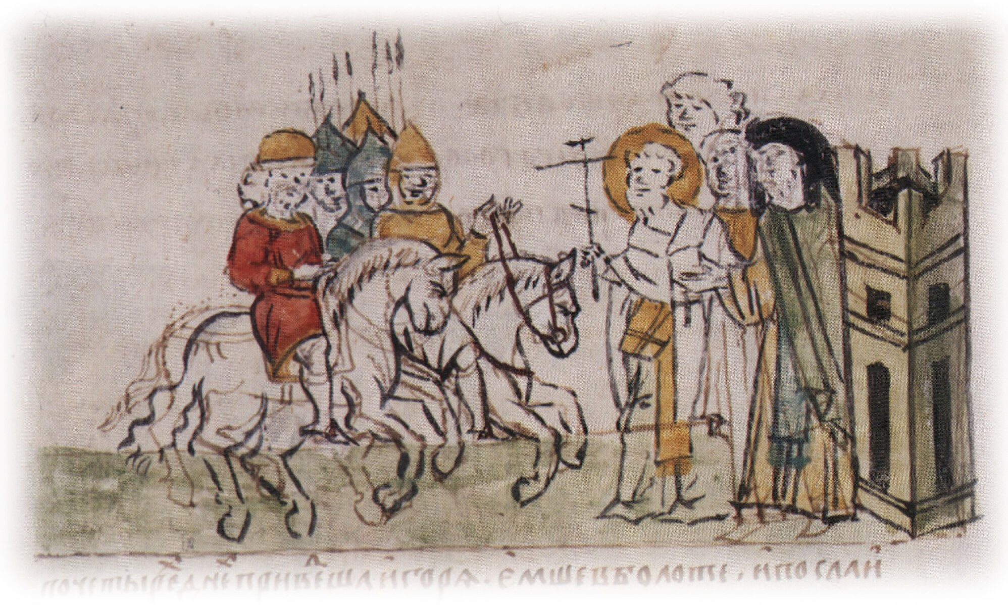 "И вниде Изяслав в Киев, хваля и славя Бога о таковей помощи Его. И выидоша противу ему множество народа, игумени с черноризци и попове всего града Киева в ризах".