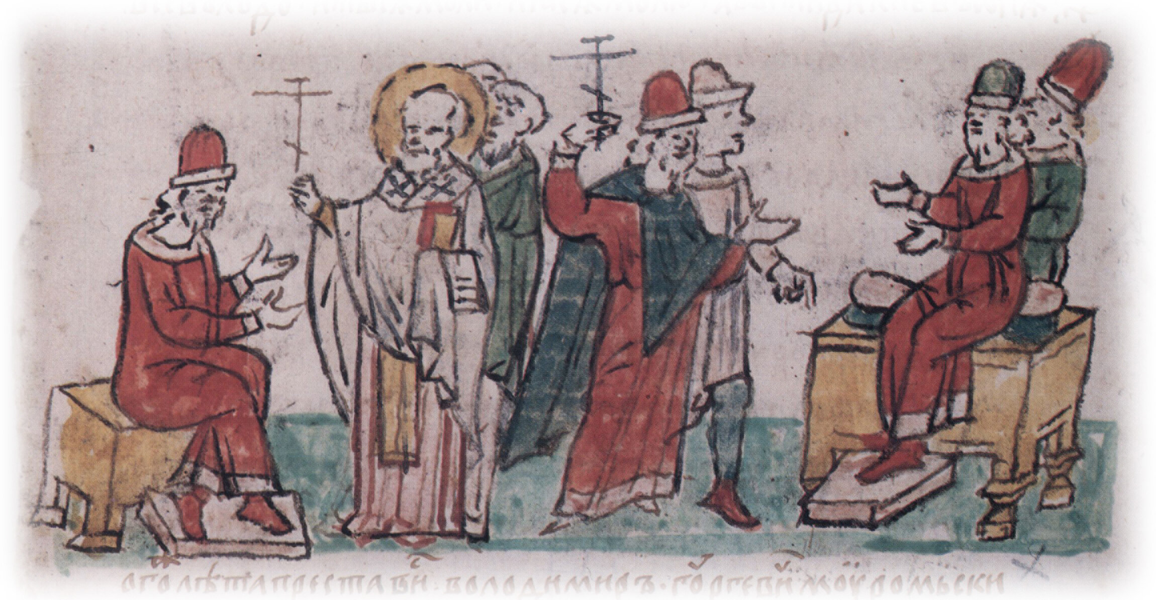 "Целова Рюрик к великому князю Всеволоду и к сыном его Костянтину и ко Всеволоду и ко его братьи. И рече Роман к Рюрикови: «То уже еси крест целовал. Пошли ты мужа своего ко свату своему... абы ти дал Киев опять»".