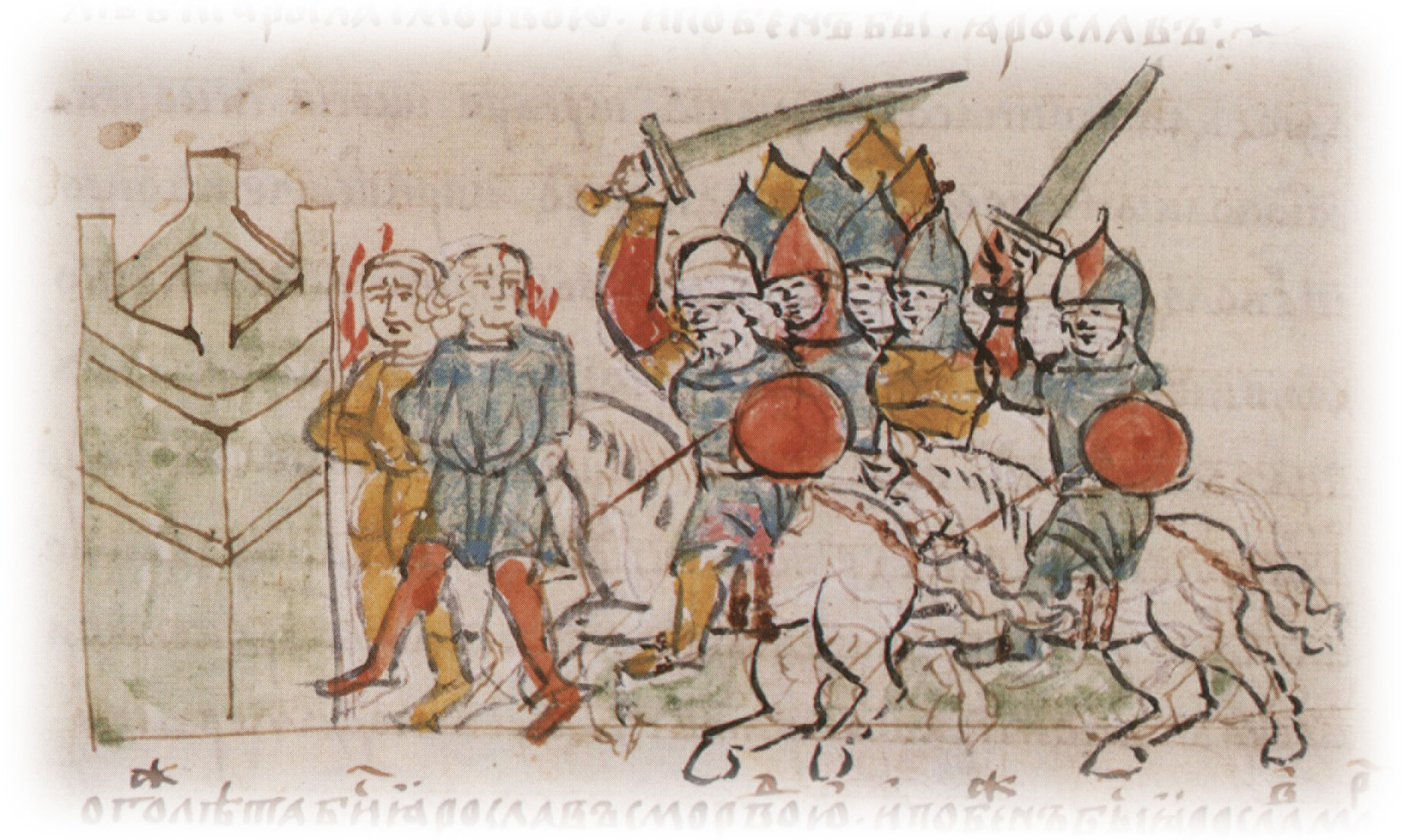 Рисунок "мастера Б" — перо. Правлен (фигуры, лица, шапка, шлемы, мечи, щиты, лошади) "мастера В" — кисть. Позднейшая пририсовка сбруи и стремян — перо.