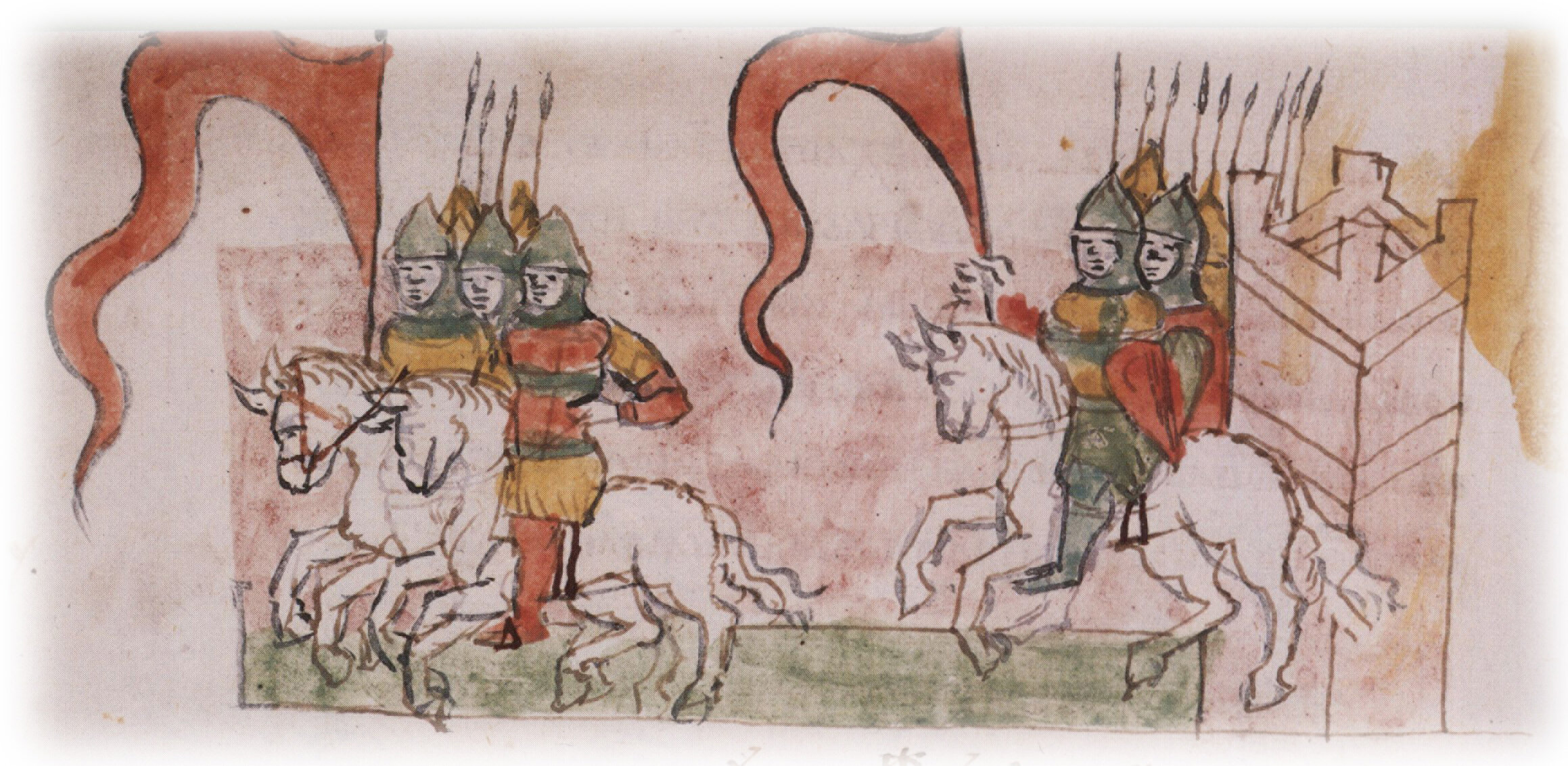 Рисунок "мастера Б" — перо. Правлен (фигуры, лица, шлемы, копья, щит, лошади) и дополнен (знамена) "мастера В" — кисть. Позднейшая пририсовка частей сбруи и стремени — перо.