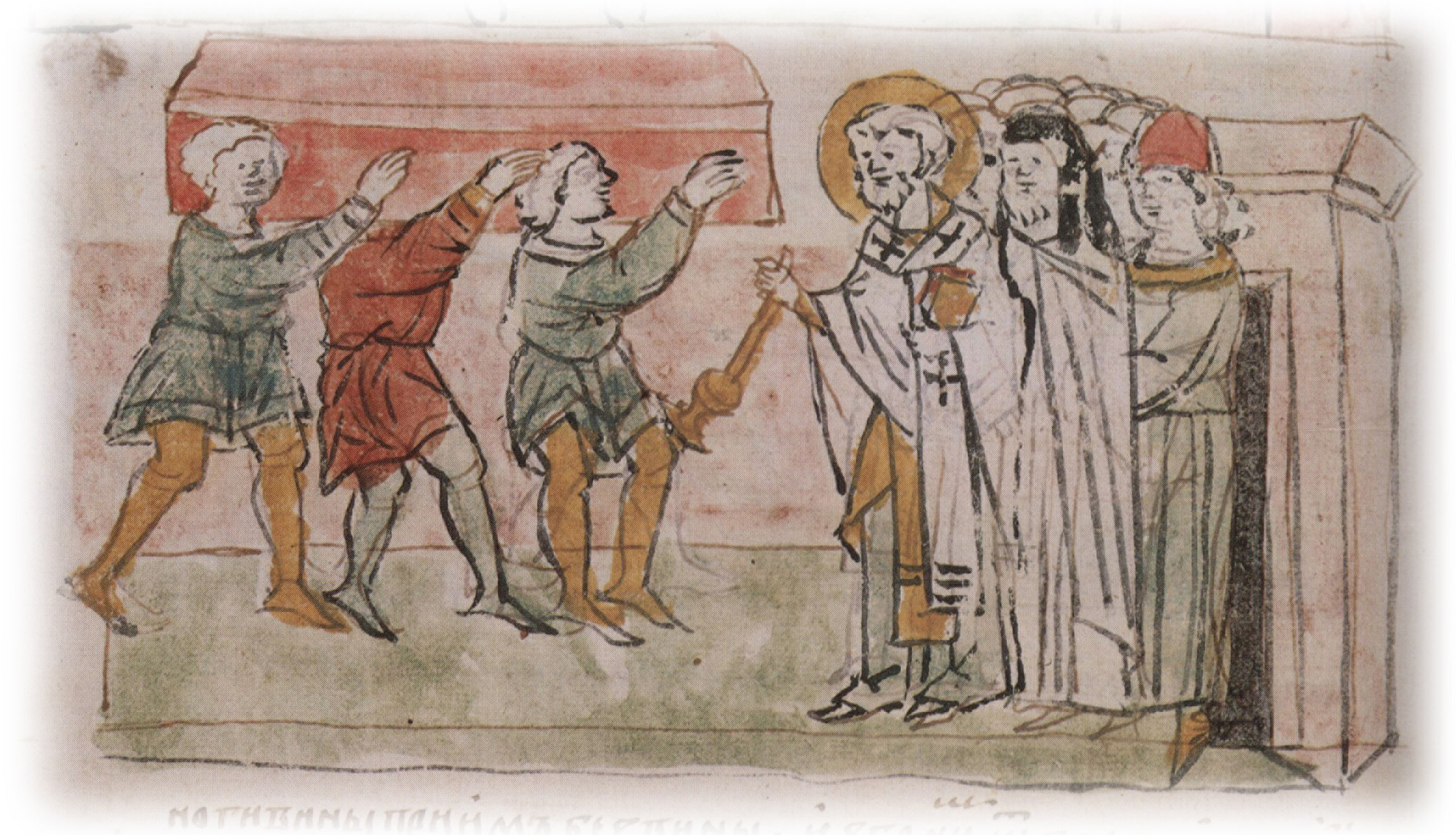 Рисунок "мастера Б" — перо. Правлен (фигуры, лица, шапка, клобук, книга, архитектура) и дополнен (нимб) "мастера В" — кисть.