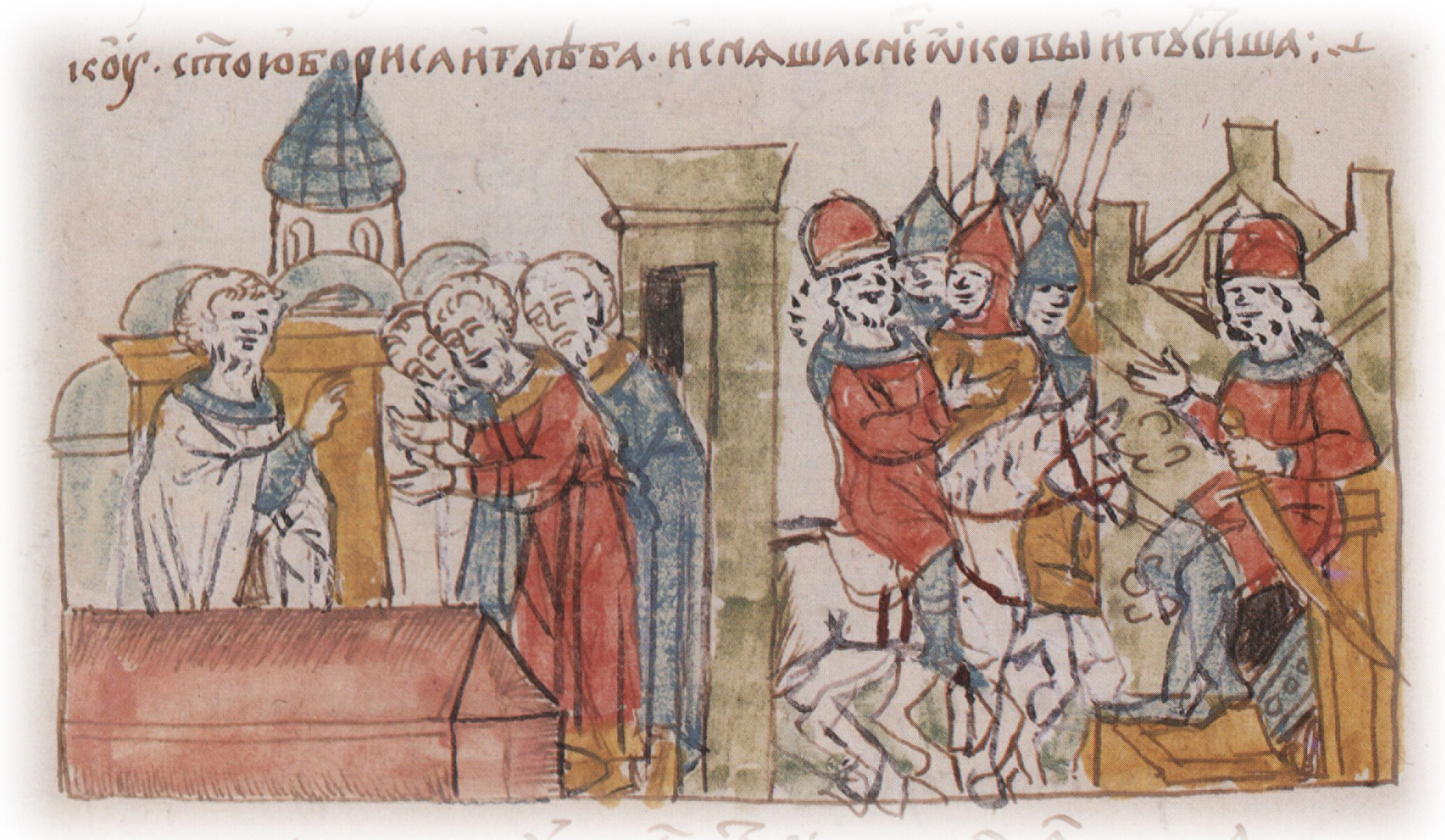 Тайное погребение Владимира Святославича, умершего в Берестове: спуск его тела на землю на ковре между разобранными клетьми здания; положение тела Владимира в мраморный гроб в церкви Святой Богородицы.