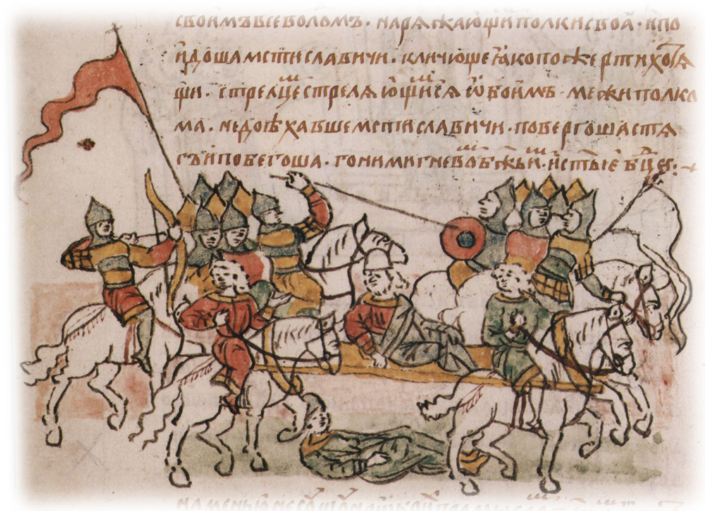 "И прииде же ко Мстиславу весть от Ярополка: «Михалко есть немощен, несут его на носилех....... Срете и Мьстислав со свеою дружиною изнезапа... стреляющимся обоим межи полкома...".