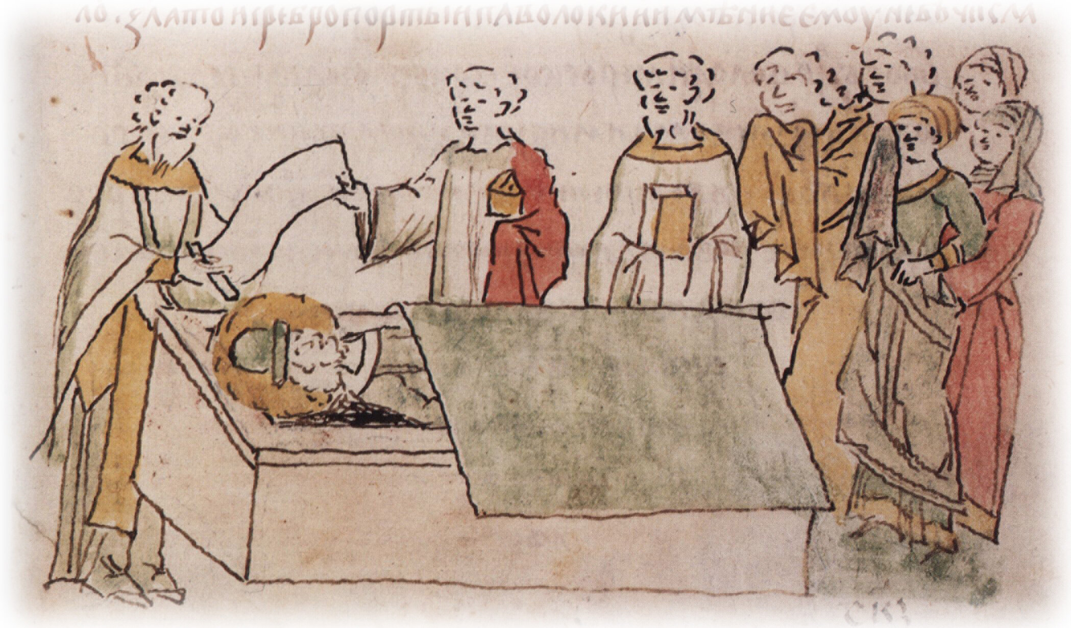 Тайное погребение Владимира Святославича, умершего в Берестове: спуск его тела на землю на ковре между разобранными клетьми здания; положение тела Владимира в мраморный гроб в церкви Святой Богородицы.