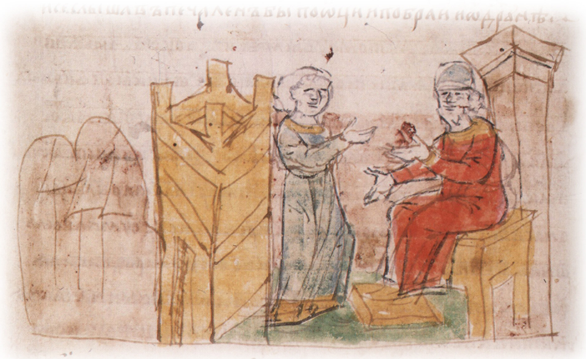 Тайное погребение Владимира Святославича, умершего в Берестове: спуск его тела на землю на ковре между разобранными клетьми здания; положение тела Владимира в мраморный гроб в церкви Святой Богородицы.