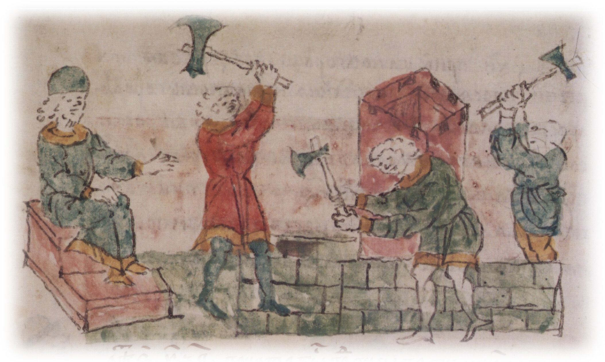 Тайное погребение Владимира Святославича, умершего в Берестове: спуск его тела на землю на ковре между разобранными клетьми здания; положение тела Владимира в мраморный гроб в церкви Святой Богородицы.