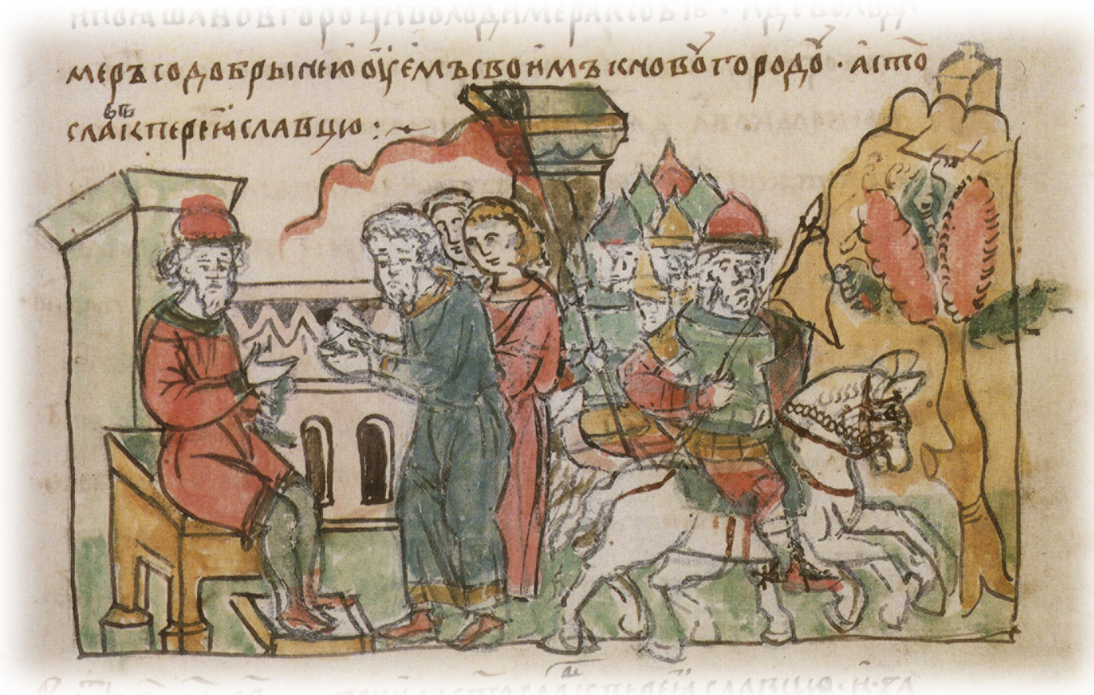 "И пояша новгородци Володимера к собе. Иде Володимер со Добрынею, уем своим, к Новугороду, а Святослав к Переяславцю".