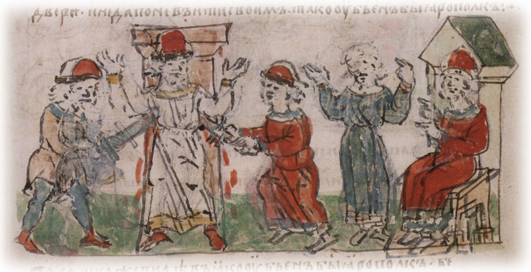 "И приде Ярополк к Володимеру. Яко влезе в двери, и подъяста два варяга мечема под пазусе. Блуд же затвори двери, и не да по нем въити своим. Тако убьен бысть Ярополк".
