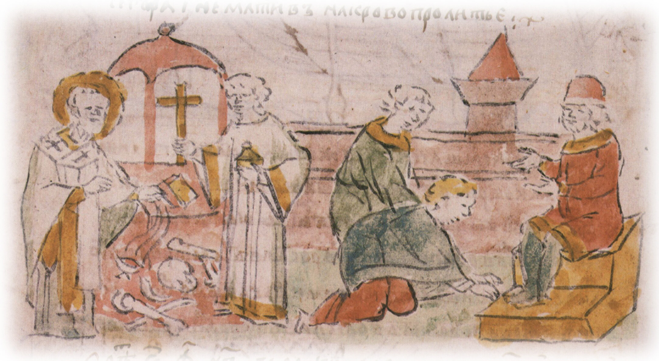 Тайное погребение Владимира Святославича, умершего в Берестове: спуск его тела на землю на ковре между разобранными клетьми здания; положение тела Владимира в мраморный гроб в церкви Святой Богородицы.