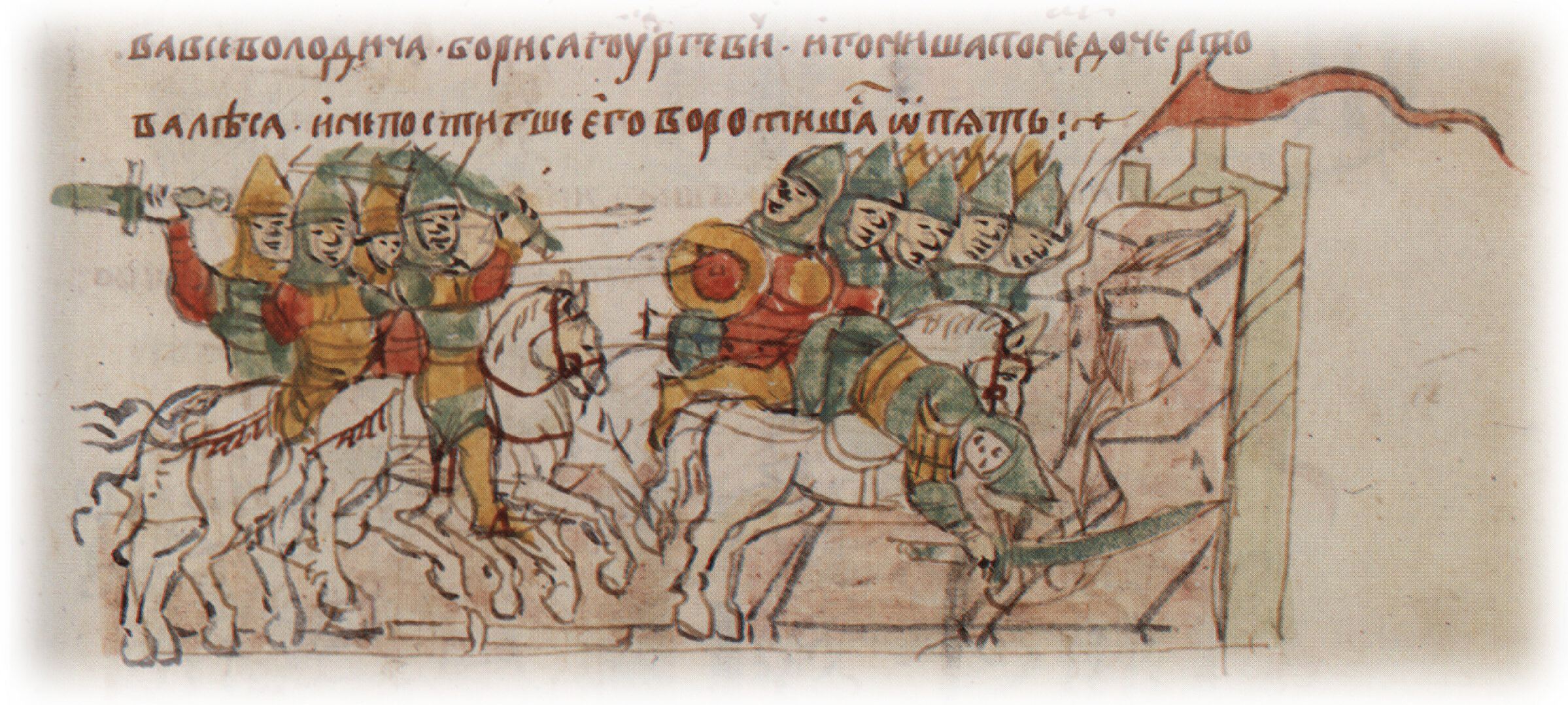 Рисунок "мастера Б" — перо. Правлен (фигуры, лица, шлемы, щит, наконечники копий, лошади, лещадка) и дополнен (рука воина с мечом слева, знамя) "мастера В" — кисть. Позднейшая пририсовка сбруи и стремени — перо.