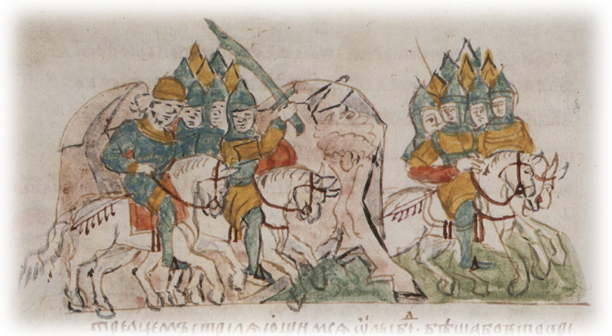 "Изяславлим сторожем стоящим на оной стороне... половци же вседше на кони... вбредуще в Днепр, и покрыша Днепр от множества вой, сторожеве же Изяславли убояшеся бежаша".