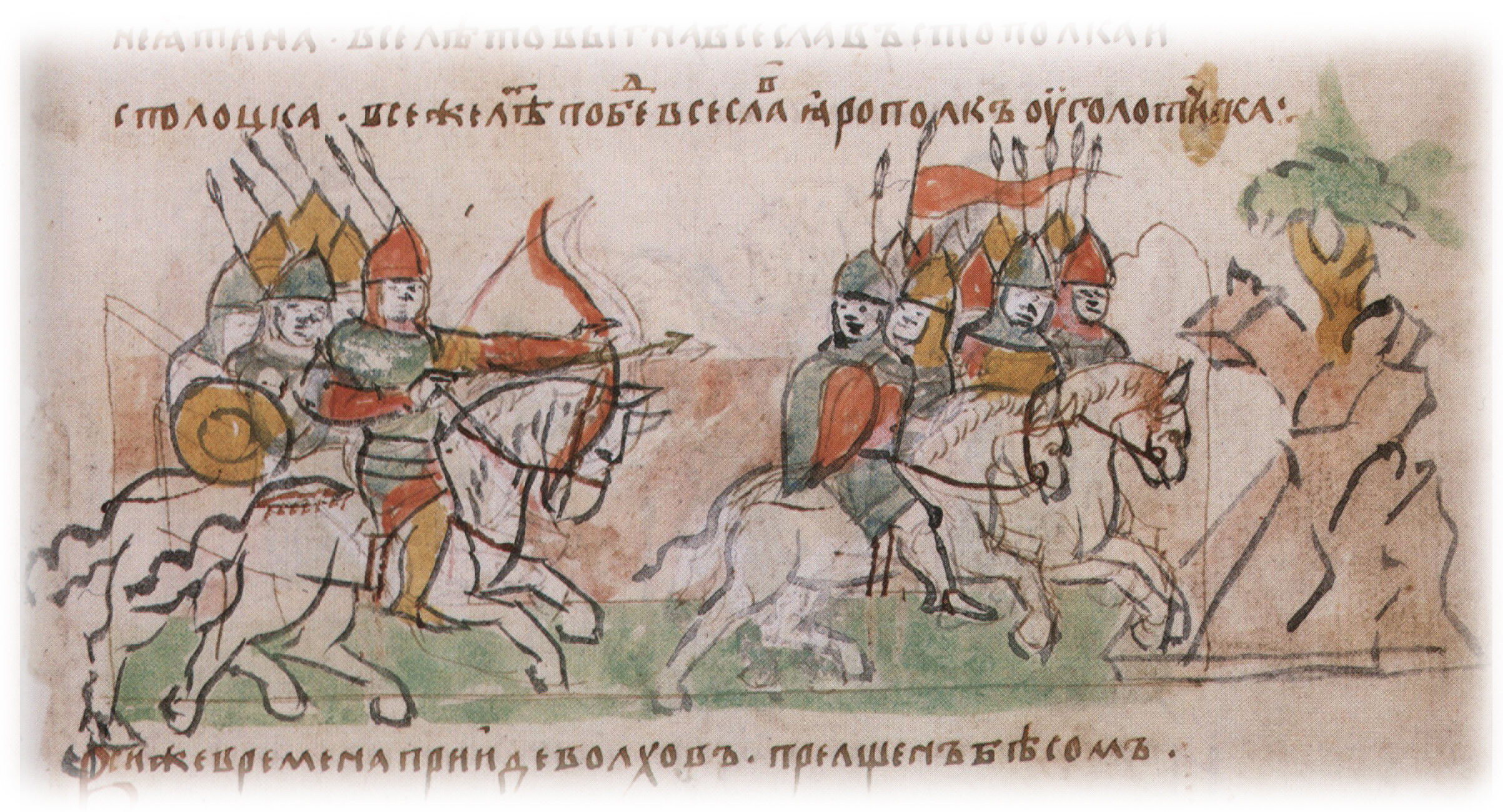 Рисунок "мастера Б" — перо. Правлен (фигуры, лица, шлемы, щиты, копья, лук, лошади) и дополнен (холм и дерево) "мастера В" — кисть. Позднейшая пририсовка сбруи и стремян — перо.