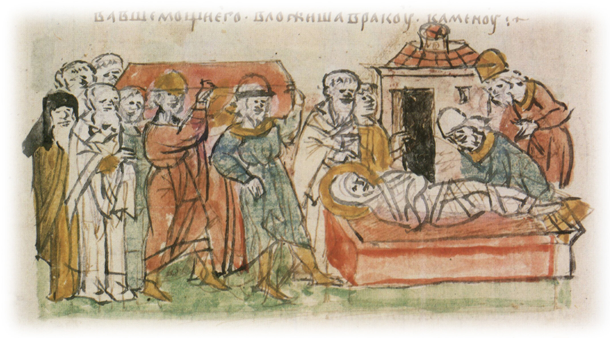 Тайное погребение Владимира Святославича, умершего в Берестове: спуск его тела на землю на ковре между разобранными клетьми здания; положение тела Владимира в мраморный гроб в церкви Святой Богородицы.