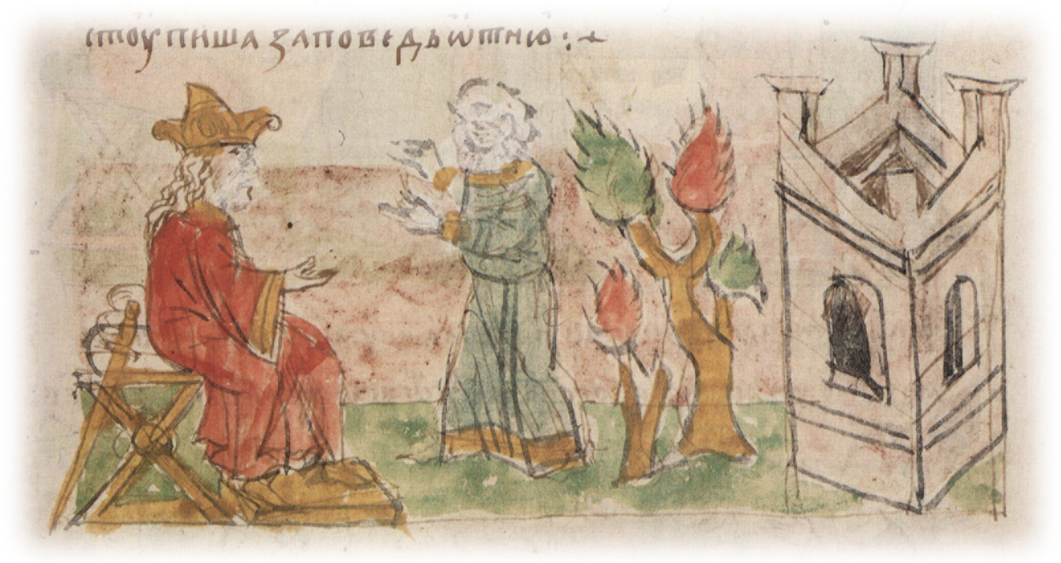 Рисунок "мастера Б" — перо. Правлен (фигуры, лица, корона, стол, архитектура, дерево) "мастера В" — кисть.