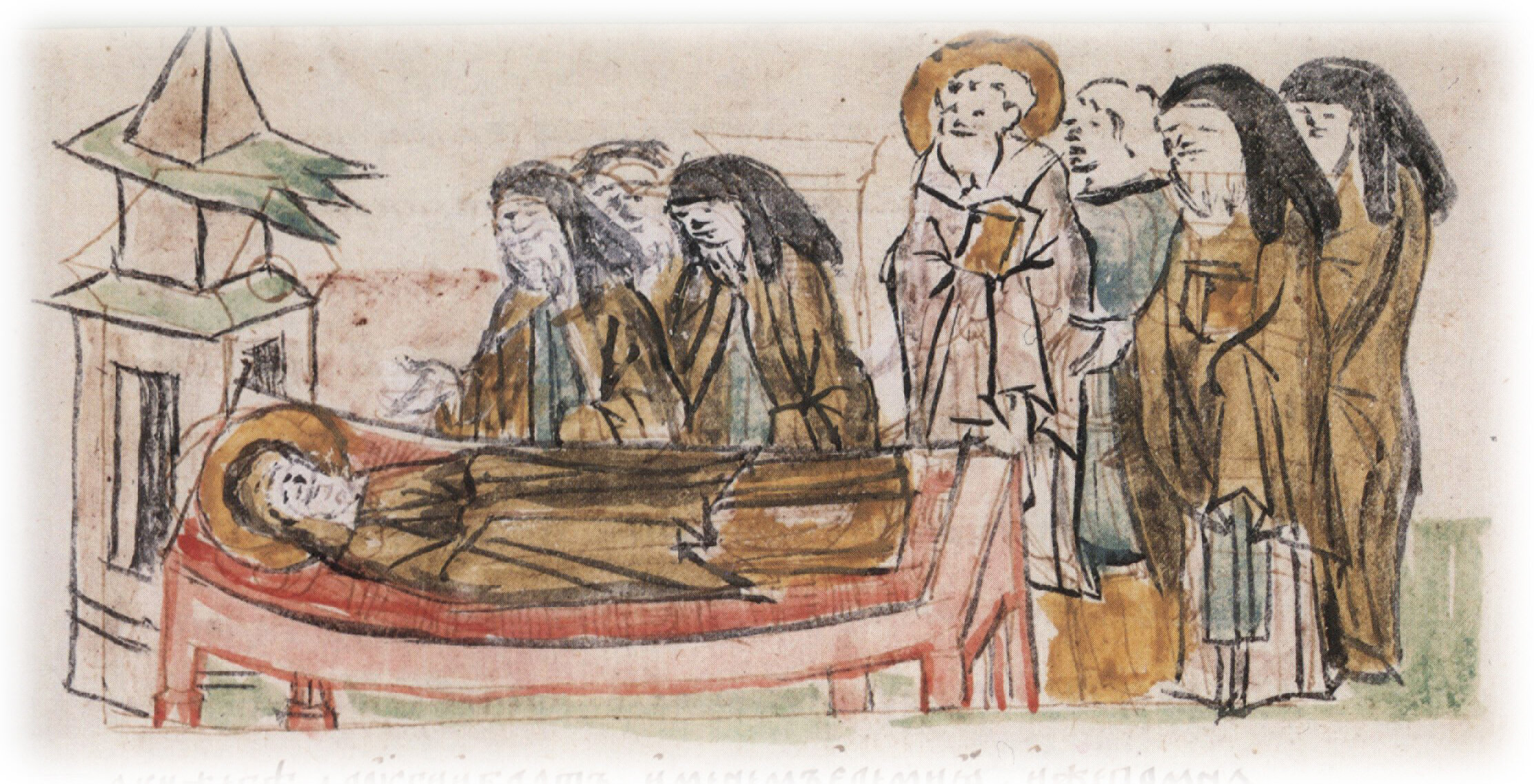 Посещение игуменом Феодосием с братией умирающего пресвитера Дамиана.