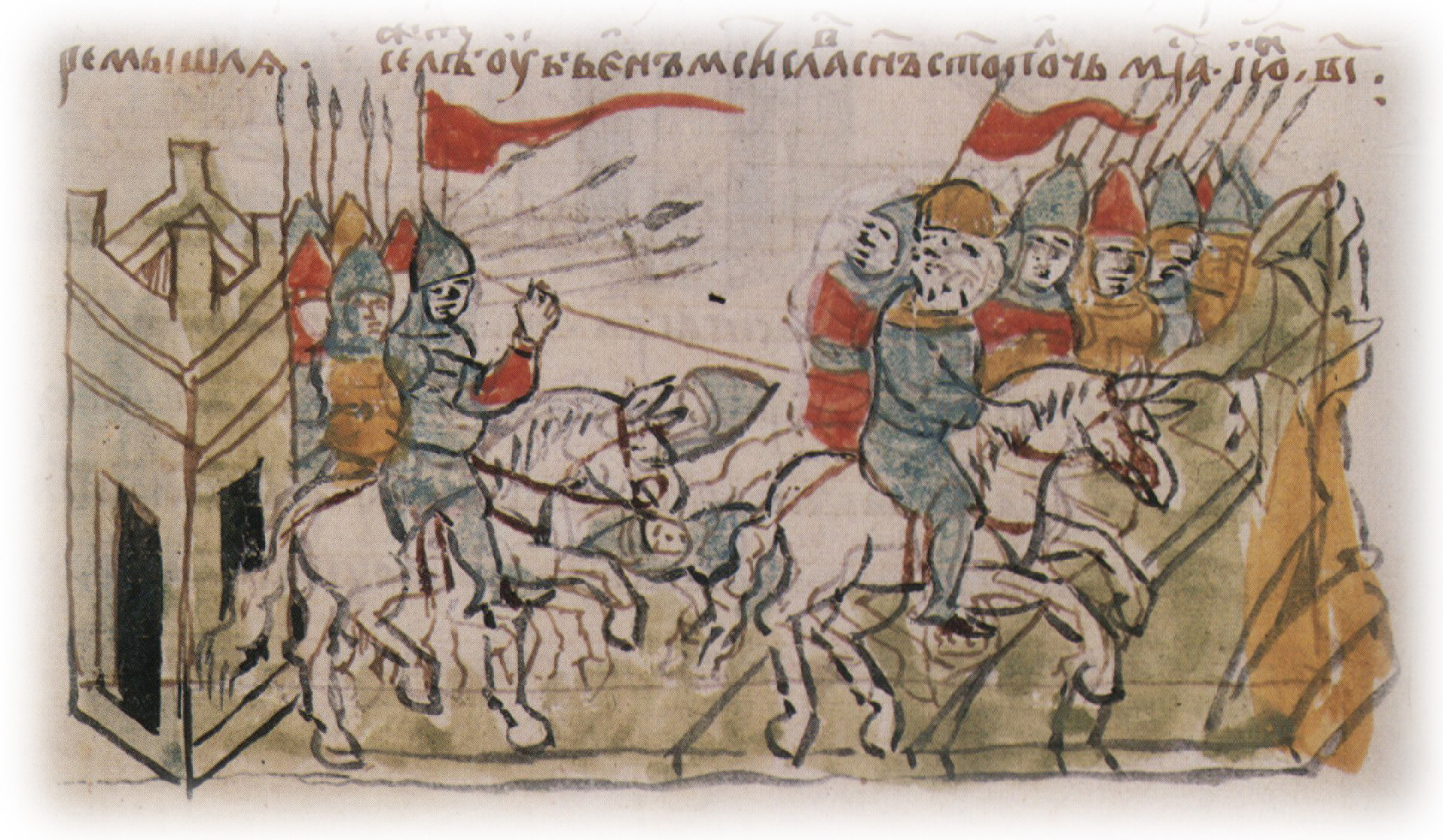 Рисунок "мастера Б" — перо. Правлен (фигуры, лица, шапка, шлемы, копья, архитектура, лошади, лещадка) "мастера В" —кисть. Позднейшая пририсовка сбруи и стремян — перо.