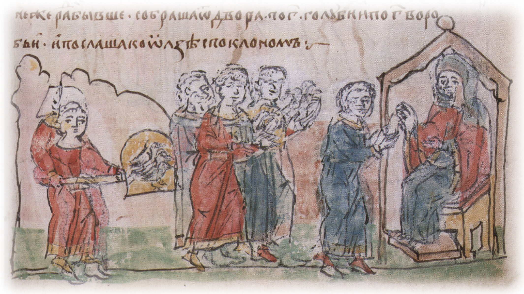 "Деревляне же ради бывше, собраша от двора по 3 голуби и по 3 воробьи, и послаша ко Олзе с поклоном".
