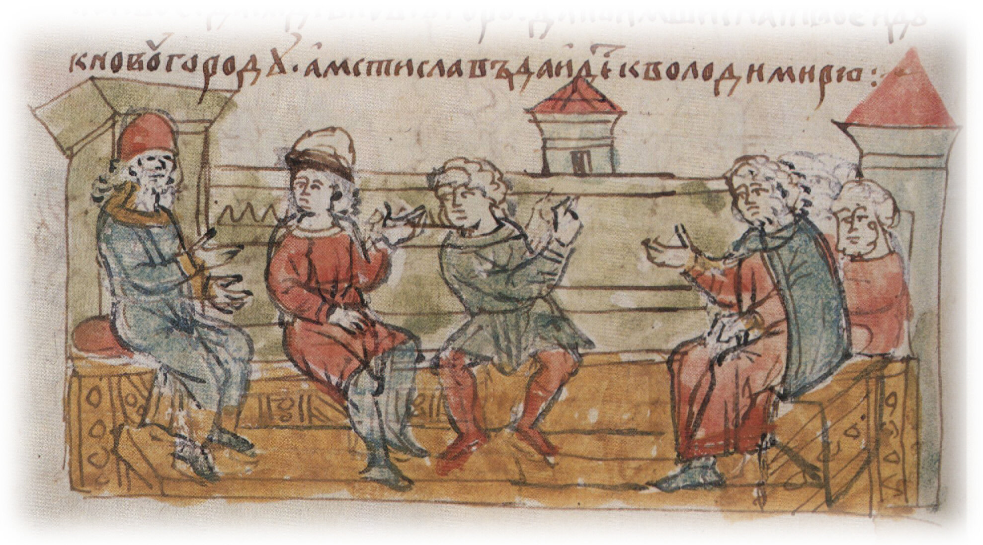 "То же лете... прииде Мстсислав, сын Володимирь, с ноугородци... к Киеву, и седоша в истьбе, и реша мужи Володимири: "Се прислал Володимир сына своего, да сядет в Новегороде, да поимши сына твоего, идут к Новугороду, а Мстислав да идет к Володимирю".