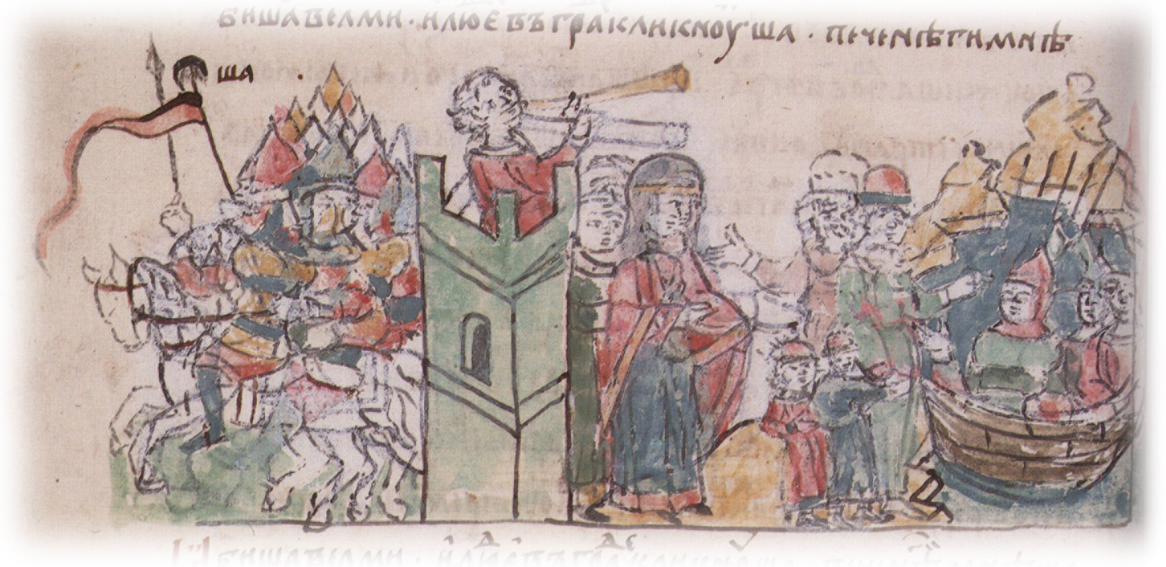 Бегство печенегов, напуганных возможностью прихода Святослава Игоревича с дружиной; встреча Ольгой с внуками и приближенными людьми на берегу Днепра прибывшей на помощь дружины в ладьях.