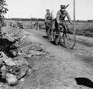 Финские солдаты рассматривают убитых красноармейцев. Лето 1941 г.