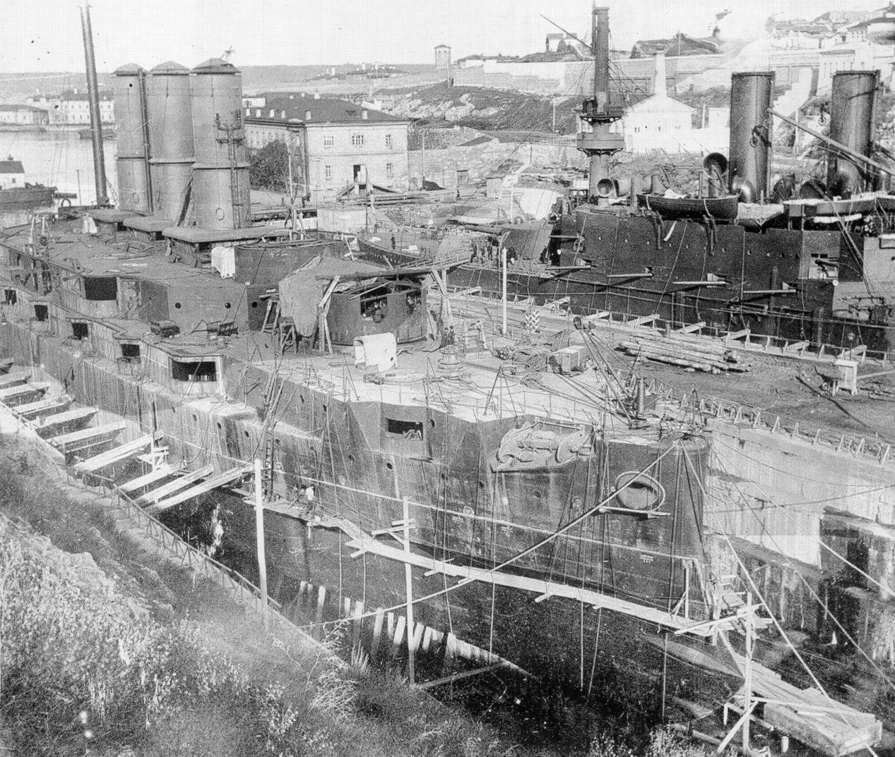 Линейные корабли Иоанн Златоуст и Три святителя в доке Лазаревского адмиралтейства, 1908-1909 годы.