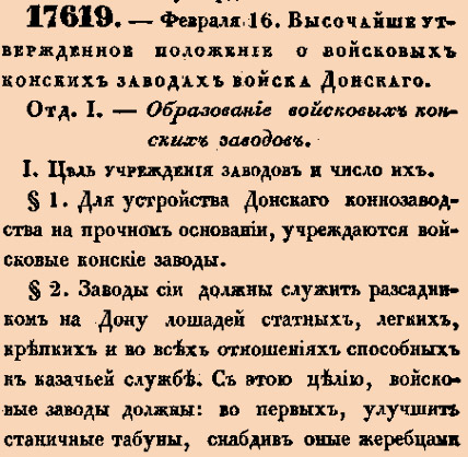 17619. 1844 год. 16 февраля (28 февраля). Высочайше утвержденное положение о войсковых конских заводах войска Донскаго.