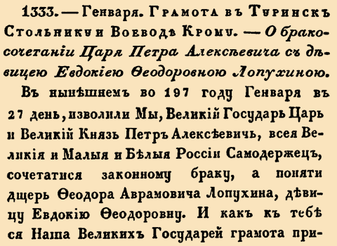 Закон № 1333. 1689 год. 27 января (6 февраля). Официальное уведомление туринского воеводы о бракосочетании царя Петра I Алексеевича с Евдокией Федоровной Лопухиной.