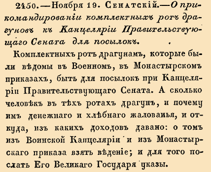2450. — Ноября 19. Сенатский, 1711 год.О прикомандировании рот драгунов к Канцелярии правительствующего Сената для посылокКомлектных рот драгунам, которые были ведомы в Военном, в Монастырском приказах, быть для посылок при Канцелярии Правительствующего Сената. А сколько человек в тех ротах драгун, и почему им денежного и хлебного жалования, и откуда, из каких доходов давано: о том из Воинской Канцелярии и из Монастырского приказа взять ведение.