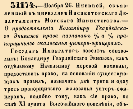 31174. 1856 год. 26 ноября (8 декабря). Именной, объявленный в циркуляре Инспекторского Департамента Морского Министерства. О предоставлении командиру Гвардейского Экипажа права назначать 2/3 и 1/3 прапорщичьего жалования унтер-офицерам