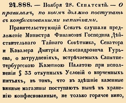 24. 1811 год. 28 ноября (10 декабря). 888. —. Сенатский. О правилах, по коим должны поступать с конфискованными напитками