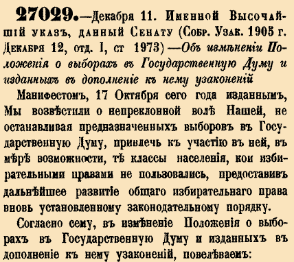Закон № 27029. 1905 год. 11 декабря (24 декабря). Закон об изменении избирательной системы 1905 года (Закон о расширении избирательных прав).