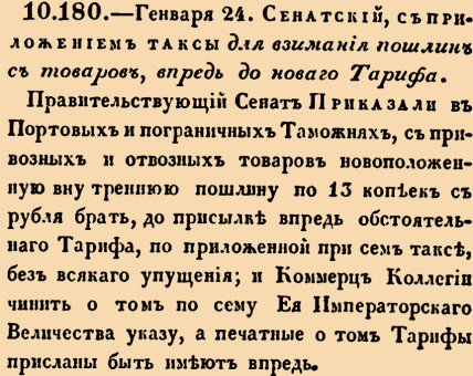 Закон № 10180. 1754 год. 24 января (4 февраля). Указ Правительствующего Сената о временном порядке взимания внутренней таможенной пошлины в размере 13 копеек с рубля в портовых и пограничных таможнях до утверждения нового Тарифа.