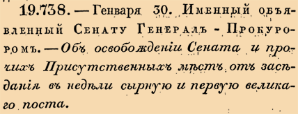 Закон № 19.738. - 1801 год. 30 января (11 февраля).Об установлении нерабочих дней в Сенате и государственных учреждениях на период Сырной седмицы и первой недели Великого поста.