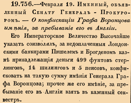Закон № 19756. 1800 год. 19 февраля (2 марта). Именной указ о частичной конфискации и полном секвестре имений генерала графа С.Р. Воронцова в обеспечение долга лондонских банкиров и в наказание за невозвращение из Англии.