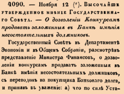 4090. 1830 год. 24 ноября (12 ноября ст.ст.) Высочайше утвержденное мнение Государственнаго Совета. О дозволении Конкурсам продавать заложенныя в Банк имения несостоятельных должников.<…> Что при невозможности конкурса выкупить заложеннаго банкротова имения и при недостатке прочаго имущества на покрытие всех долго банкрота, конкурс неминуемо должен продолжаться на отдаленное время, к явному подрыву и даже разрушению частнаго кредита, мнением полагает: дозволить конкурсам продавать заложенныя в Банке (по предварительном объявлении о том Банку) имения несостоятельных должников, с переводом на покупщиков Банковаго долга.