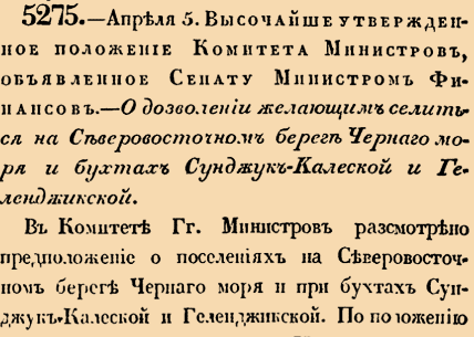 5275. 1832 год. 17 апреля (5 апреля ст.ст.) Высочайше утвержденное положение Комитета Министров, объявленное Сенату Министром Финансов. О дозволении желающим селиться на Северовосточном береге Чернаго моря и бухтах Сунджук-Калеской и Геленджикской.В Комитете Гг. Министров разсмотрено предположение о поселениях на Северовосточном береге Чернаго моря и при бухтах Сунджук-Калеской и Геленджикской. По положению о сем Комитета, Государь Император в 5 день текущаго Апреля, признав единственным на первый раз средством к основанию в том крае Российскаго населения без напрасных трат для казны, дозволение желающим людям свободнаго состояния селиться там, с дарованием свободы от податей и повинностей