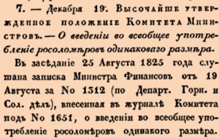 Закон № 7. — 1825 год. 19 декабря (31 декабря). Закон о введении единого стандарта измерительных приборов (росоломеров) на соляных заводах Российской империи.