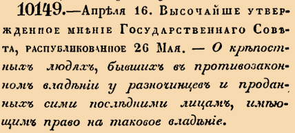 10149. 1837 год. 28 апреля (16 апреля ст.ст.) Высочайше утвержденное мнение Государственнаго Совета, распубликованное 26 мая. О крепостных людях, бывших в противозаконном владении у разночинцев и проданных сими последними лицам, имеющим право на таковое владение. <…> Купленные дворянином люди, доказавшие, что они были пред тем противозаконно приобретены разночинцем, во всяком случае от сего новаго покупщика отбираются; но если он представит узаконенныя выше доказательства о добросовестном их приобретении: то, при отобрании, получает за них установленное законом вознаграждение <…>