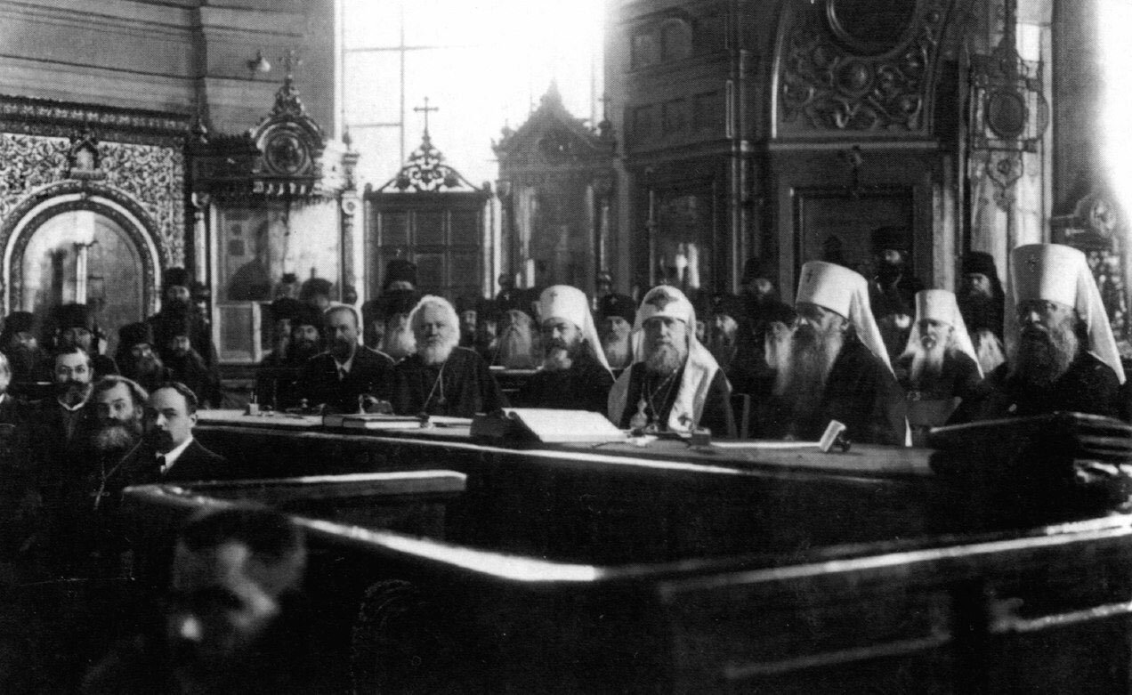 В президиуме слева направо: кн. Евгений Трубецкой, прот. Николай Любимов, митр. Арсений Стадницкий, Патриарх Тихон, митр. Антоний Храповицкий