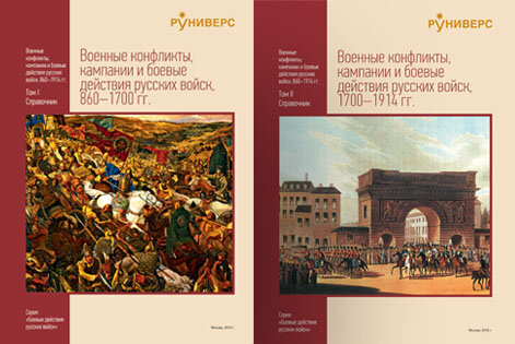 Обложки двухтомного справочника «Военные конфликты, кампании и боевые действия русских войск 860–1914 гг.»