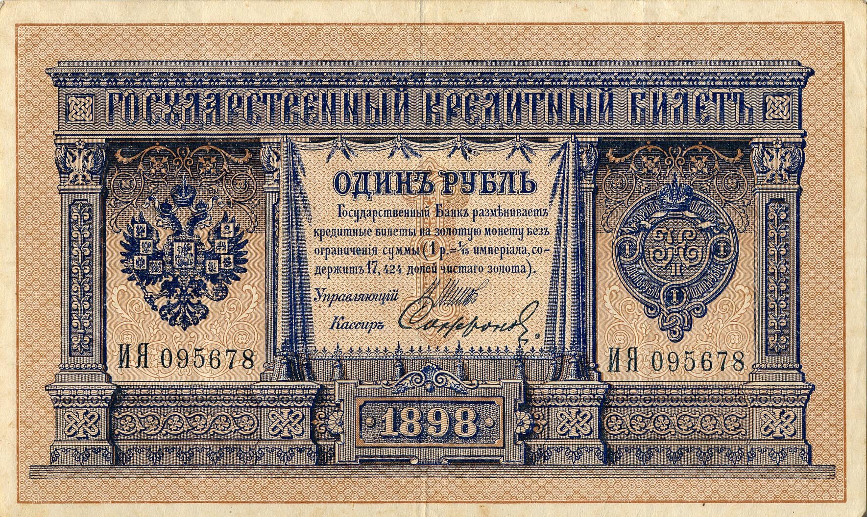 Банкнота Российской империи достоинством в 1 рубль образца 1887 года (выпускалась до 1915 года), лицевая сторона
