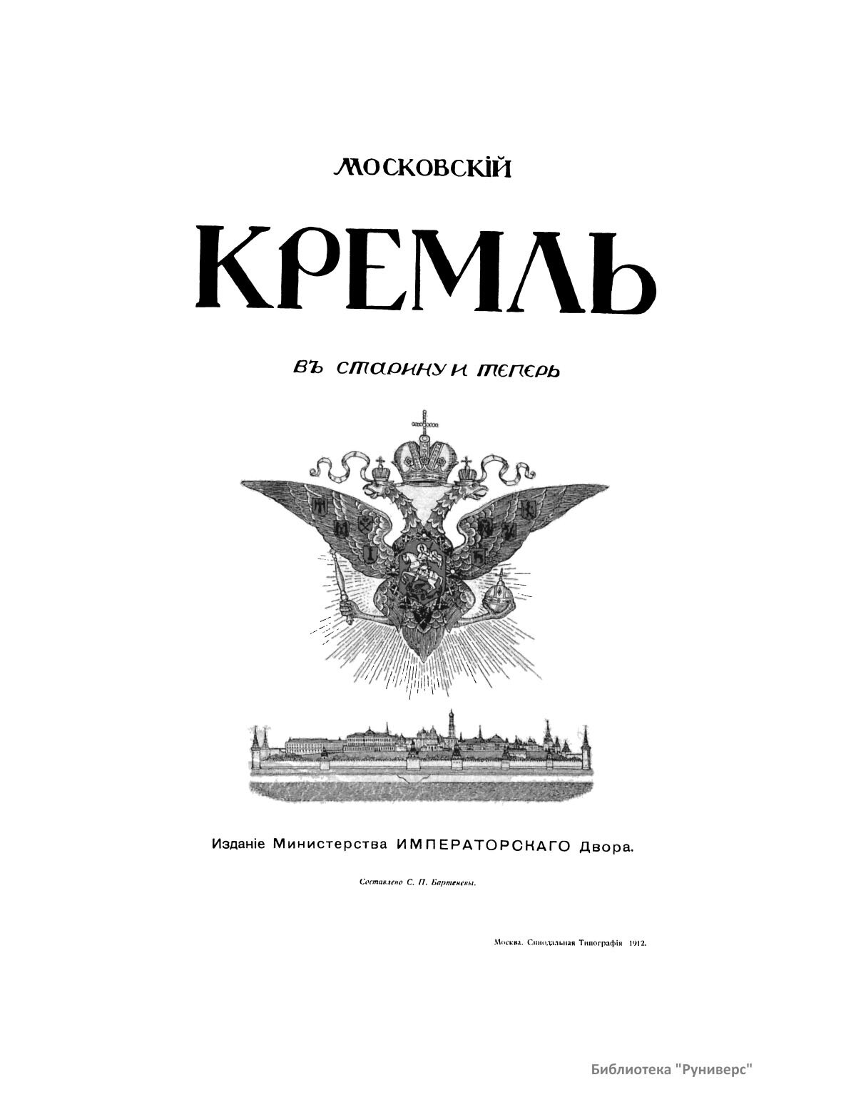 Титуьный лист издания: Бартенев С. П. Московский Кремль в старину и теперь. — М., 1912.