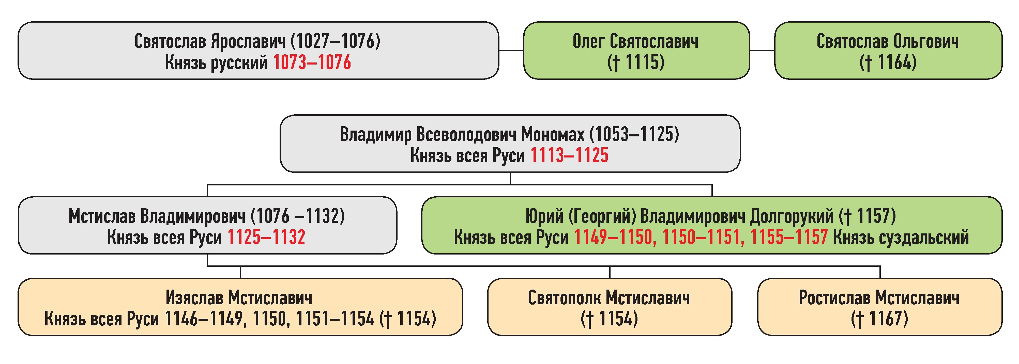 Юрий Владимирович — сын Владимира Всеволодовича Мономаха, Олег Святославич — сын Святослава Ольговича, Святослав Ольгович — сын Олега Святославича, Изяслав, Ростислав, Святополк Мстиславичи — сыновья Мстислава Владимировича