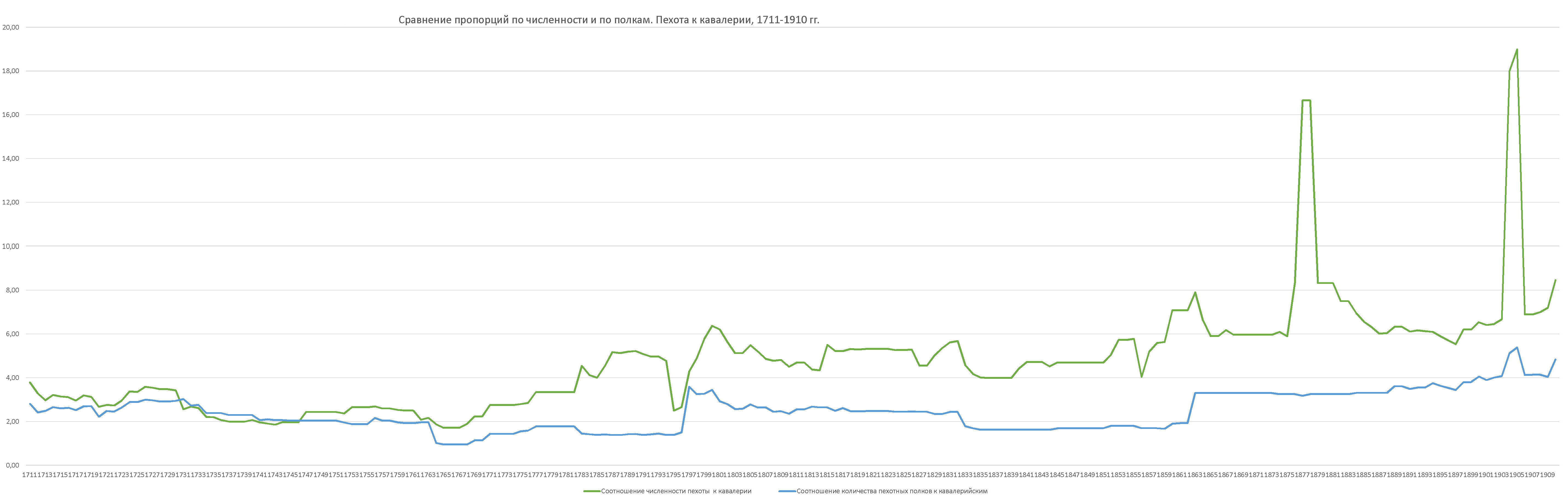 Сравнение пропорций по численности и по полкам русской армии, пехота к кавалерии