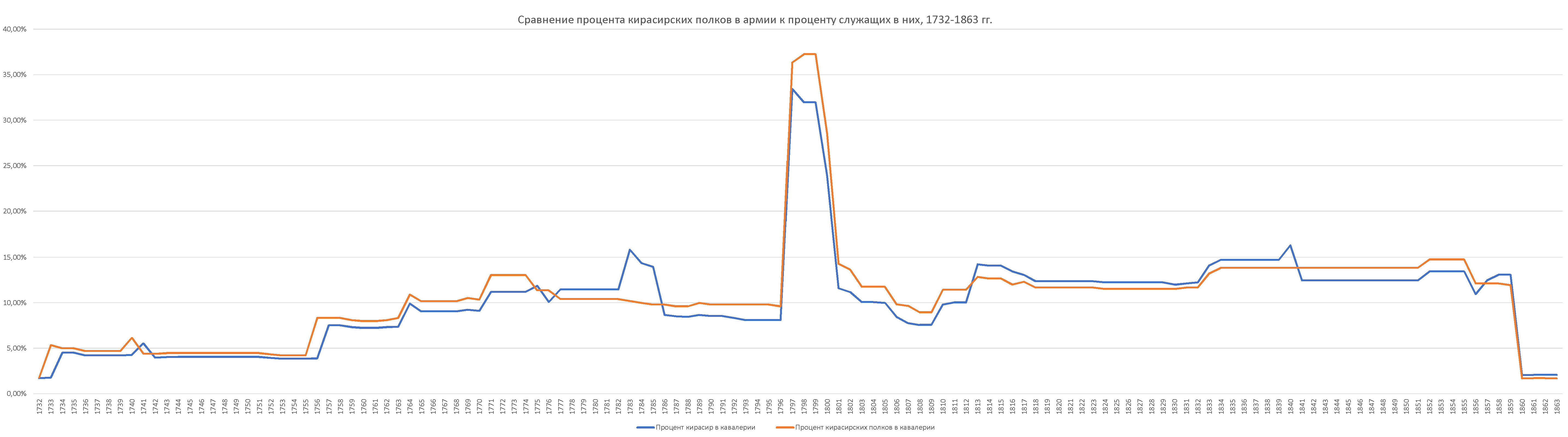 Сравнение процента кирасирских полков в армии к проценту служащих в них русской армии